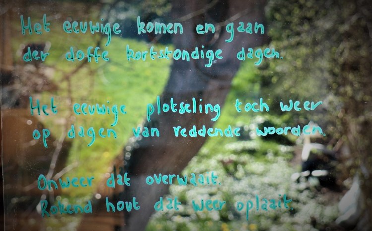 Thuiskomen bij jou, dat liep deze week wat moeizamer. We slingerden nogal heen en weer. Ik vond het vorige zondag op moederdag heerlijk om onze kinderen terug te zien in de tuin. Dat liet me mijmeren. Deze mensen, zo verschillend van elkaar, ze zouden er niet zijn, mochten wij niet samen zijn. Het ultieme thuiskomen ligt toch in ons vrijen. Die lichaamstaal valt niet uit te leggen maar te ervaren. Onze kinderen dus: ze komen uit dat fragiele & krachtige voort. Tot zover de filosofie 🙂 Bij elkaar thuiskomen dat heeft te maken met communiceren, luisteren, tijd maken voor elkaar. Daar gingen we deze week een beetje de mist in. Als ik naar mezelf kijk dan zie ik dat mijn teleurstelling en verdriet over het feit dat onze kleinkinderen niet op bezoek komen me parten speelde. Plots zag ik lege dagen voor me en ik heb ze vakkundig opgevuld door me op vertaalwerk te storten. Ik liet me daardoor helemaal opslorpen en maakte met tegenzin tijd voor andere dingen, voor jou… Dat gaf natuurlijk afstand, misverstanden, wrijving. Weinig thuis daar of juist wel want zeer herkenbaar hoe we dan samen de mist in gaan. Jij zette de eerste stap naar verzoening, redelijkheid,verbinding. Leven is leren vallen en opstaan! Gelukkig herken ik de weg. We zijn nog steeds onderweg een huis aan het bouwen voor ons twee.